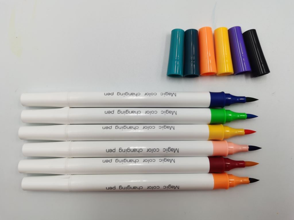 Details Magic color changing pen 218, the pen have 12 colors , using the white tip can draw 24 colors. Size : 16.9*1.1 ,Tip ; double brush tip , using : Color head to draw a pattern, can use white head to change color. body with 1 color logo. Type: Art Marker Package: PVC Bag, PP Bag, Paper Box...